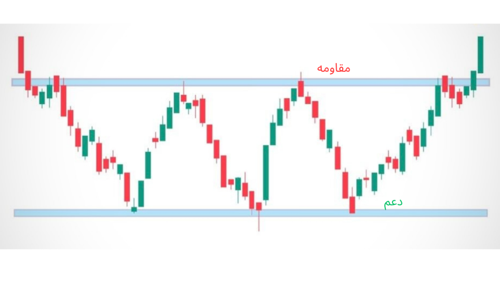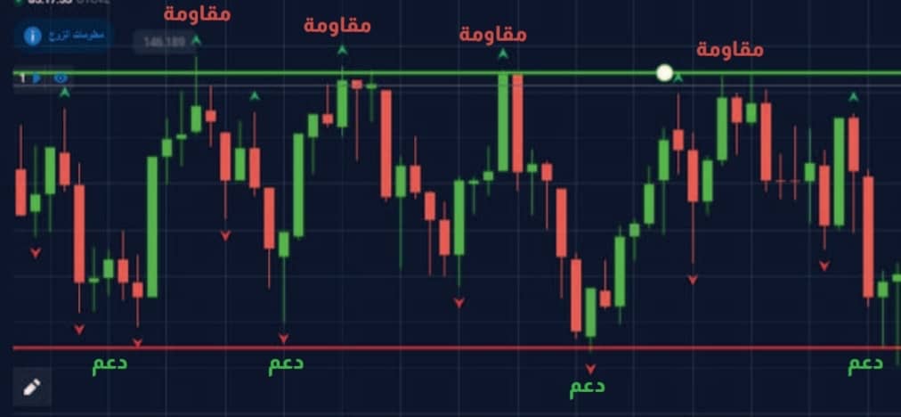 شكل يوضح حركة السعر ضمن نطاق محدد بين مستويي دعم ومقاومة.