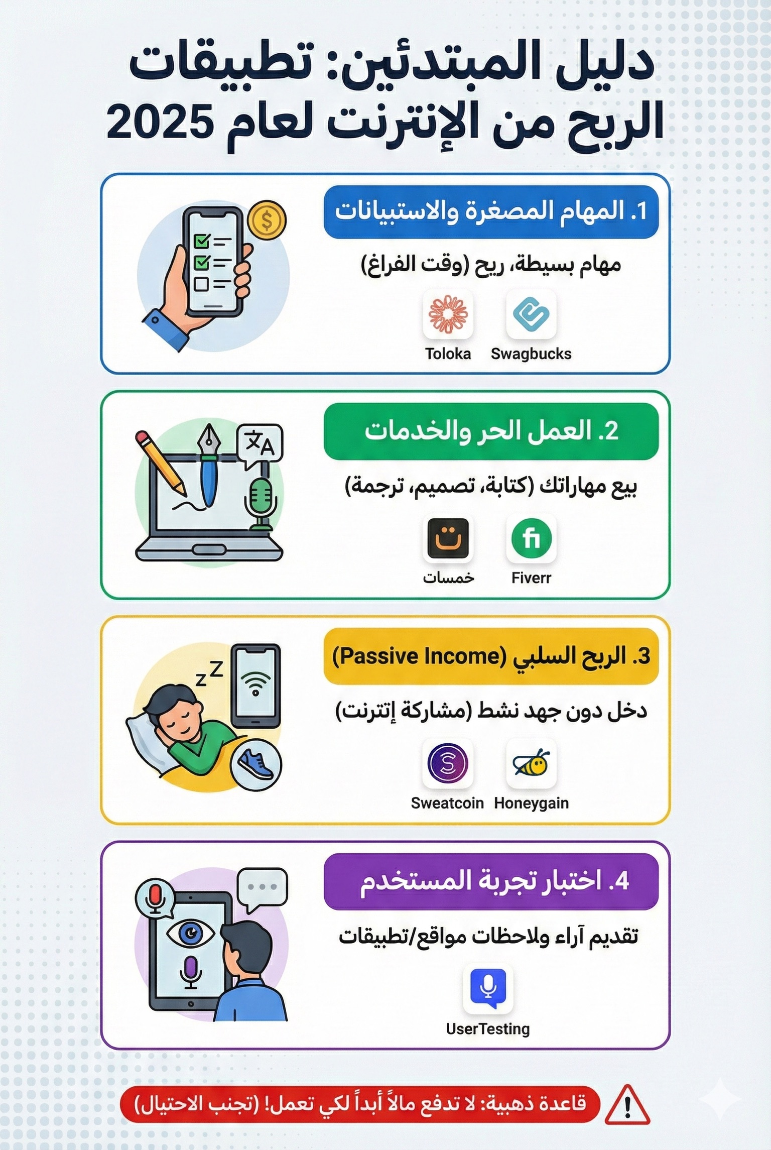 1. القاعدة الذهبية: لا تدفع سنتاً واحداً لكي تعمل. أي تطبيق يطلب منك “رسوم اشتراك” أو “شراء باقة VIP” لتبدأ بجني الأرباح هو نصب واحتيال بنسبة 100%.